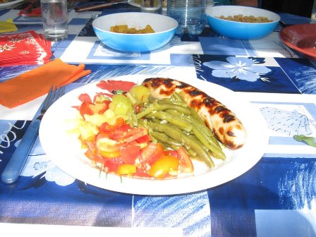 Here’s my mom’s home cooked dinner that she prepared for herself. A grilled calf sausage with beans, tomatoes, potatoes and some salads.